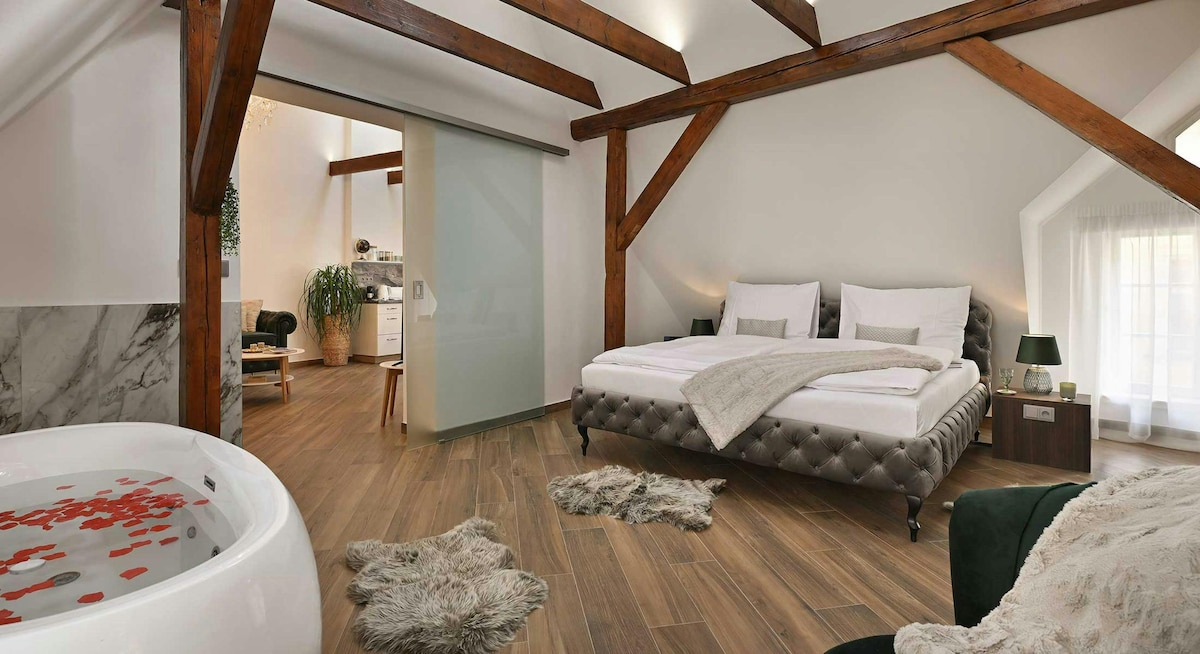 The luxurious Royal Suite with air conditioning and a modern bathroom with bathtub is located in the historic center of Prague at the 4* Hotel Liliová. It offers panoramic views of the Old Town. You can easily walk to all of the most prominent sights in a few minutes. The room is suitable for a family with 1-2 children or up to 3 adults. In the summer months there is a cozy garden in the courtyard of the building. Breakfast available on site 12 Eur/person.