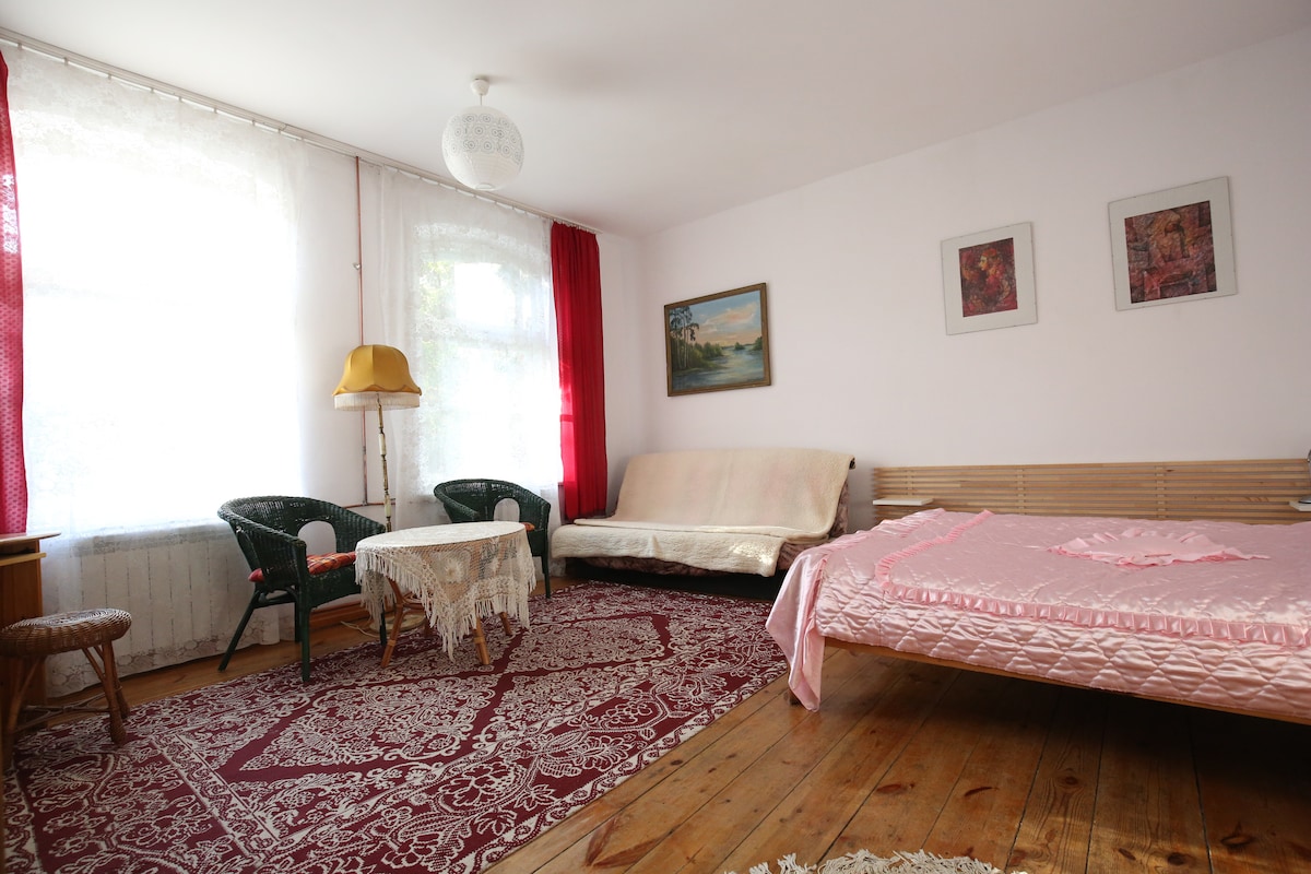 Witam serdecznie, Na dużej, ogrodzonej posesji dom z cegły. Zapraszam do obejrzenia reszty pokoi z naszej oferty i odwiedzenia naszej strony internetowej pod adresem:www.dworackie.com.pl Do zaoferowania mamy pokój 25 m2 na piętrze możliwość połączenia z pokojem dziecięcym. W pokoju jest miejsce dla 2 Oprócz pokoju mogą Państwo korzystać z przestrzeni wspólnej, na którą składa się: kuchnia salon salonik kominkowy oraz udogodnień takich jak: łódka z silnikiem kapoki rowery czy świeże owoce z sadu
