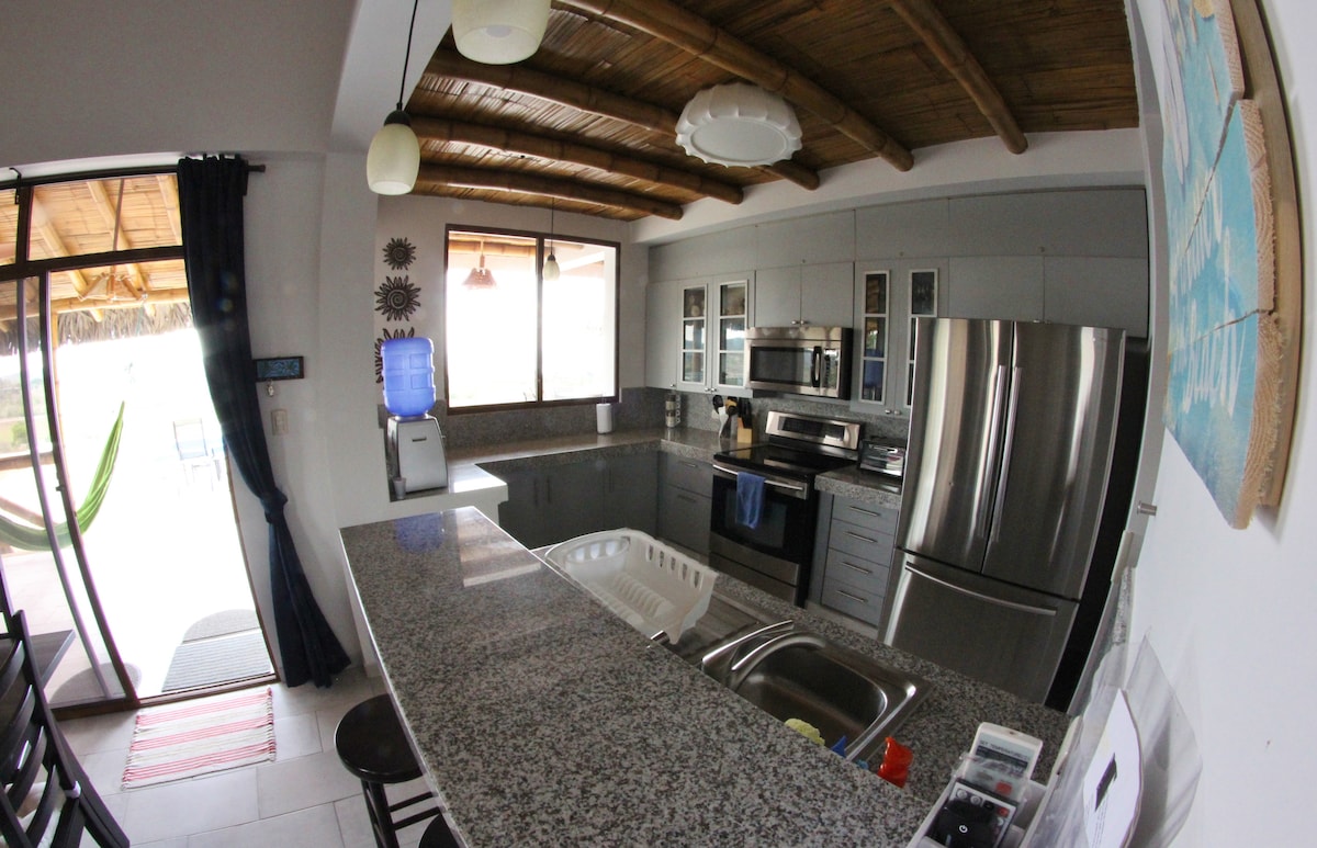 Amazing ocean and mountain views in this beautiful home inside gated community with 24-hour security. 2-3 min drive to the beach and 5-min drive to Montañita for dining, nightlife and surfing. Or just relax in the private patio with private pool, jacuzzi, plenty of hammocks and a BBQ grill. Fully furnished kitchen, large master with balcony, A/C in all rooms. NO PETS ALLOWED. Extra nightly charge after 6th guest.
