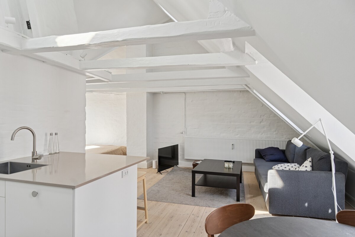 Intle kakhulu kule ndawo iphakathi kumgangatho we-5, ekungenwa kuyo ngelifti. Igumbi lokuhlala elivulekileyo nelitofotofo elineendawo ezintle, ikhitshi elinento yonke, igumbi lokulala elikhulu elinebhedi enkulu, negumbi lokulala lesibini elitofotofo elineebhedi ezimbini. Igumbi lokuhlambela liquka umatshini wokuhlamba impahla. Ijonge iNyhavn, eneevenkile zokutyela ezininzi, iivenkile zokutyela, iibhari nezinto ezinika umdla kubakhenkethi ezikufuphi, kunye neendawo ezintle zolwandle