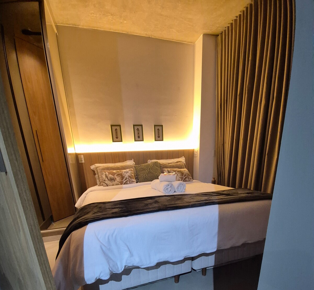 Flat localizado dentro do Hotel Grand Mercure Itaim. Cama de casal no quarto, sofá na sala, 01 TV 48 polegadas, mesa auxiliar, varanda com mesa e 2 poltronas, banheiro e uma copa equipada com microondas, cafeteira Nespresso e frigobar. Sinta-se no aconchego de sua casa com a comodidade dos espaços públicos de um hotel Conte com piscina, sauna, academia, cafeteria e restaurante no lounge, além de serviço de quarto das camareiras. Fique neste lugar único com ótima localização para não perder nada