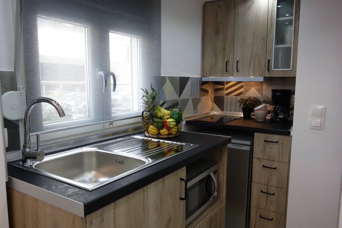 Le flethi okanye indlu ekwicomplex ephambi kolwandle inebhalkhoni evulekileyo eneendawo ezintle zeThermaikos Bay neThessaloniki. Iquka igumbi lokuhlala elikhulu nelitofotofo elinesofa etshintsha ibe yibhedi elala abantu ababini, nekhitshi elinesofa eyongezelelekileyo. Igumbi lokuhlambela elincinci kodwa elitofotofo lineshawa netephu yezinto ezidingwa yimihla ngemihla. Ikhitshi lineoveni encinci nezinto zokuhlamba iimpahla. Ukongezelela, kukho i-Wi-Fi engaphelelanga eyi-300 mbps. Iflethi okanye indlu ekwicomplex ilungiswe ngokupheleleyo.