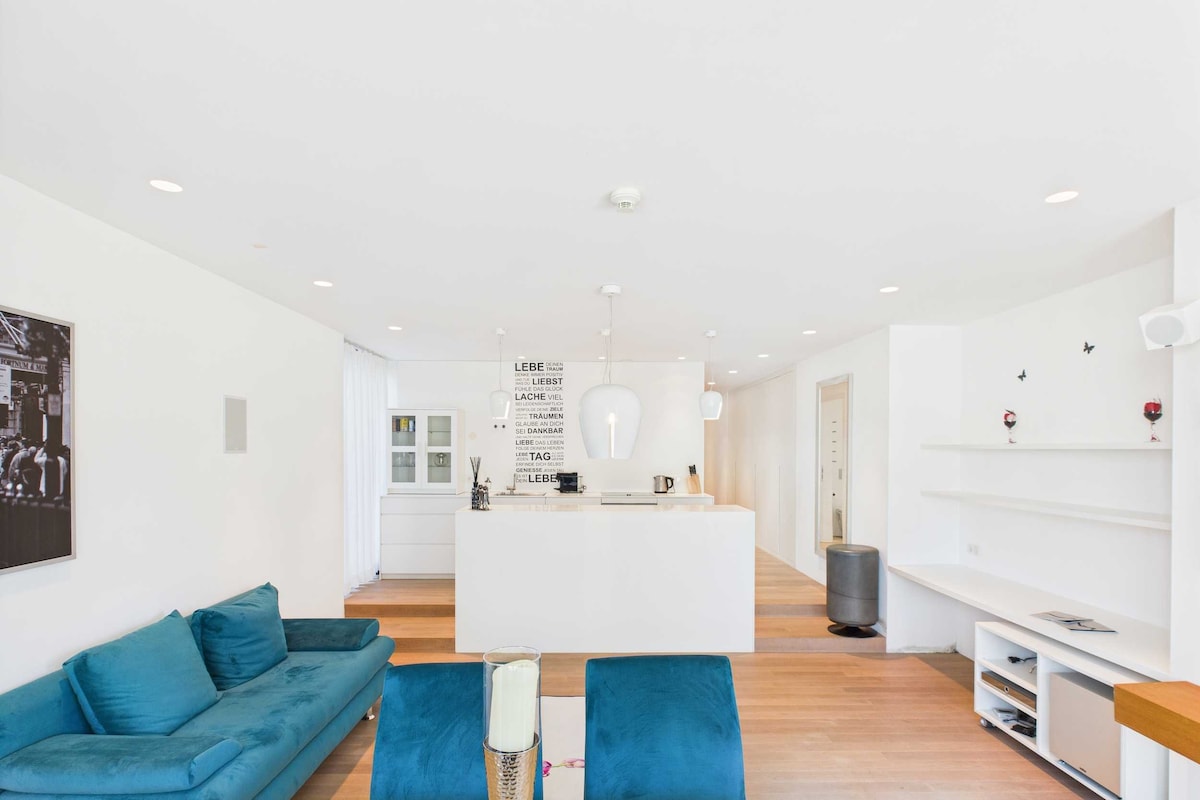 Iflethi entle kwindlu enendawo yokuphola entle enomoya omninzi, IBHALKHONI ENKULU nendawo entle, ecaleni komlambo i-Inn promenade. Iifestile ezininzi kwigumbi ngalinye, zikhanya kwaye zinelanga Ukuba ungathanda ukutyelela idolophu endala yaseInnsbruck usenokuhambahamba ecaleni kweRiver Inn okanye uthathe i-bycicle kwisikhululo se-Nextbike kuyo yonke indlu. Umnyango wokungena kwi-Freeway kufutshane, ivenkile enkulu, ikhemisi, iyunivesithi, ikliniki,i-WKO, ngaphakathi kokuhamba kancinci. INDAWO YOKUPAKA YASIMAHLA phambi kweVilla. I-2 flatscreen tv ( 2xnetflix) Bose Bluetooth Music