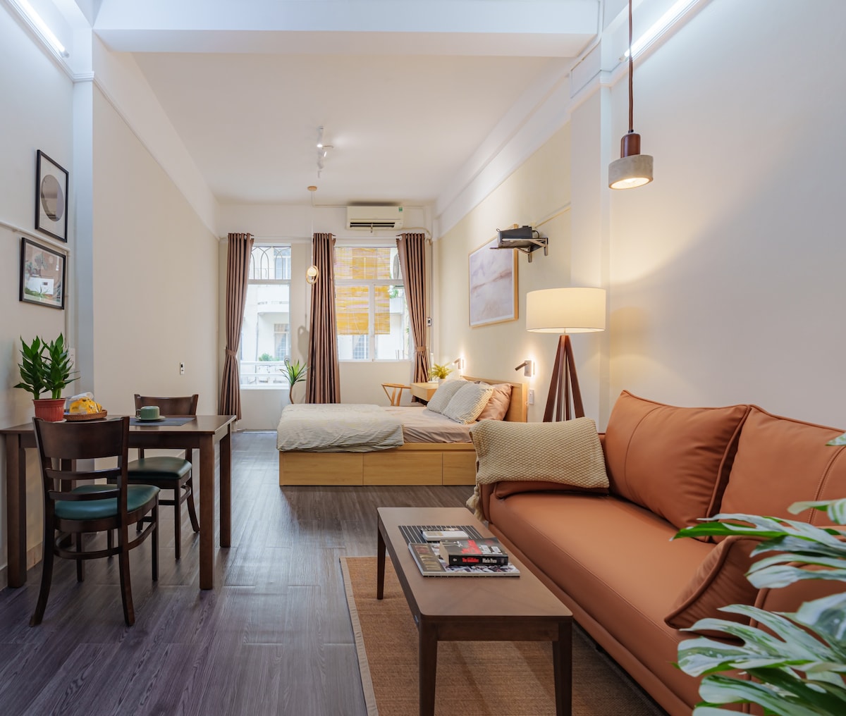 [Newly renovated September-2025] Bui Vien walking street - District 1 Relax in 40m2 spacious flat with queen bed, 2-seat leather sofa, wide-view balcony, right in city center. Restaurants, bars, cafes, massage, and convenience stores are all within a 100m walk. On 1st floor, your Japandi paradise has full amenities. No elevator, but the wide and gentle stairs are no sweat! 💪 Enjoy 100-inch projector for movie nights, a cozy 1.6m sofa, a fully-equipped kitchen, and a hot shower bathroom.