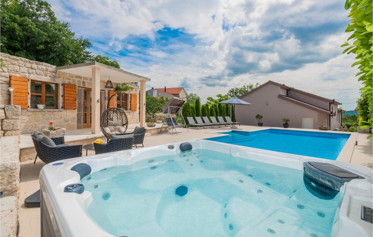 Kuća s grijanim bazenom,okucnicom,povrtnjakom i privatnim parkingom... Kuća ima 4 sobe s 3 bračna i 2 kreveta za djecu.Sve sobe su klimatizirane i opremljene smart TV. 3 kupaone i velikim dnevnim boravkom... Kuća ima centralno grijanje i klima uređaj,bezicni internet, satelitsku antenu,mašinu za robu i sudja... Vanjski kamin,vanjsku terasu...
