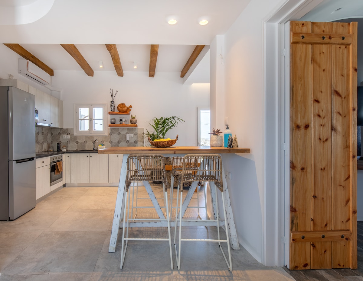 Wamkelekile kwiflethi yethu etofotofo ekumgama wemizuzu nje embalwa ukusuka embindini wedolophu yaseMykonos. Ilungele iintsapho, izibini nabahlobo abanendawo yokupaka ibe kulula ukufikelela kuzo ezitratweni ezizele ziivenkile zokutyela, imarike, indawo yokubhaka nokunye! Izinto ezikhoyo: -Iibhedi ezinkulu ezintathu namagumbi okuhlambela amathathu, amabini kuwo anegumbi elinomnyango ophumela ngaphandle Umatshini okhupha umoya obandayo okanye oshushu -I-intanethi ye-Wifi ukuya kutsho kwi-200mbps yesantya -Ikhitshi elixhotyiswe kakuhle -Igumbi lokuhlala elivulekileyo elikhokelela kwindawo yokuhlala ephandle enokutshona kwelanga nokubuka ulwandle - Umatshini wokuhlamba nowokuhlamba izitya