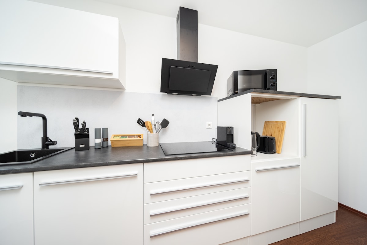 📍“Iflethi entle ekhonkrithi kwimida ethe cwaka yaseMunich. Idizayini encinci, ikhitshi elinento yonke negumbi lokuhlambela lale mihla elineshawa. Ilungele iholide yokuphumla okanye uhambo oluhonjiswe kakuhle esixekweni!” 📍UAirbnb usoloko enomatshini wokwenza ikofu waseNespresso (kuquka iipads ezikhethiweyo), izimuncumuncu, ucoceko kunye neemveliso zeshawa (kuquka i-steamer nento yokomisa iinwele) ukuze ukwazi ukuhamba ngemithwalo elula. Imizuzueyi-30 noLoliwe oya Kwiziko Lesixeko ukusuka Emnyango ukuya Emnyango