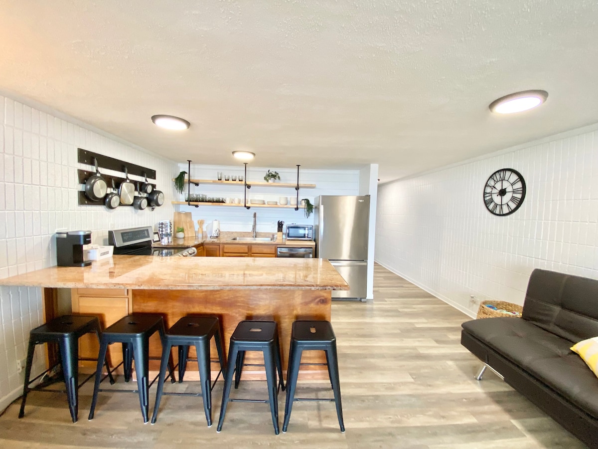 Punaluu- ulwandle olunesanti olumhlophe olumangalisayo, apho unokuqubha khona uze untywilise imini yonke okanye utsibe kwipuli yamanzi anetyuwa. UMGANGATHO OPHANTSI ophambi kolwandle kwigumbi lokulala eliyi-1 igumbi lokuhlambela elilungisiweyo elineendawo ezingaselunxwemeni. Vuka ukuze uphume ilanga, uhambe elunxwemeni oluzolileyo, uphumle kwiyure ye-cocktail, utye isidlo sangokuhlwa phandle uze ukhangele ii-turtles ngeyure yegolide. Enye yezona zicwangciso zinkulu zomgangatho eziyi-720 sq ft ngaphakathi kunye ne-240 sq ft lanai. Ukususela xa ungena kumnyango wangaphambili, indawo ezolileyo nepholileyo yemithi yolwandle nesundu yeyakho!