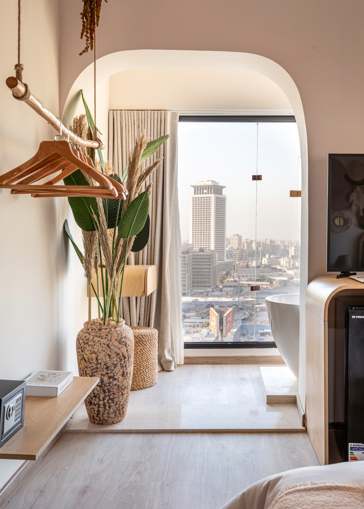 Welcome to The Free Spirit’s Escape — a boho-inspired StayBee hive where textures, colors, and soft light create a calm, soulful retreat. Sink into the bathtub with a stunning city view, enjoy your minibar, TV, coffee maker, and kettle, and relax in your private bathroom. Just 5 minutes from the Egyptian Museum and Tahrir Square, this space is made for dreamers who love beauty, comfort, and a touch of magic.