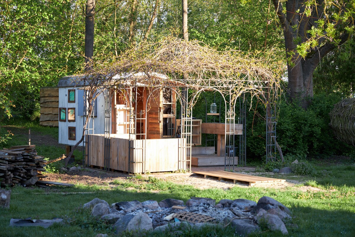 Le ndlu ihleli yodwa kulwandle lwamasimi, ihlanjwe ngumoya kwigadi entle engapheliyo. Kuba kukho abantu abaninzi osebenza nabo kunye nabahlobo, le ndlu engasemva yayingaqhelekanga ukususela kwiminyaka yoo-90 yatshintshwa yaza yalungiswa yaba yi-oasis encinci kwaye igadi yenziwa ngoncedo lomyili wendawo uRainer Elstermann. Xa bekusoloko kukhula kuze kutshintshwe, bekukho - ibe kusavela - indawo entle ekuhlala kuyo iindwendwe eziyinxalenye yabantu abayi-10.