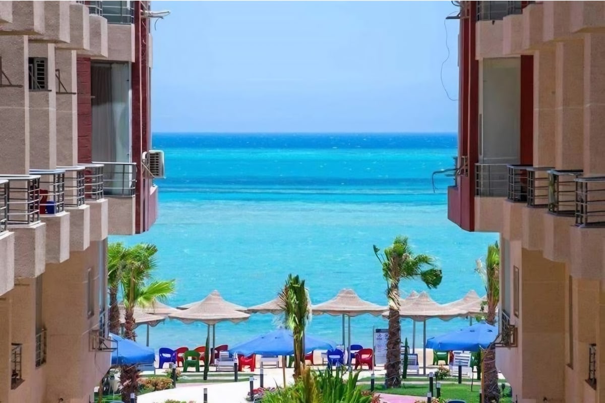 Escape to La Vista 1! Ground-floor chalet with a private garden, direct sea view, and pool steps away. 2 spacious bedrooms, 1 bathroom, full AC, LED TV with OSN & BEIN, fully equipped kitchen, and outdoor grill. Immaculately clean—refund if anything isn’t perfect. Perfect for families.