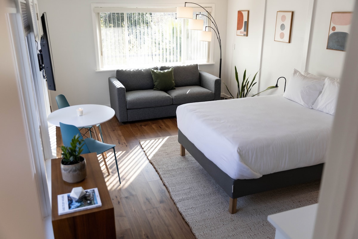 Thatha ixesha lokuphumla kule studio yeholide ekumgangatho ophezulu. Ixhonywe kwikhaya lethu kodwa izimele ngokupheleleyo (idityaniswe nodonga olusetyenziswa nangabanye abantu), unokuza uze uye kwindawo yakho yokuhamba neyokungena. Le studio enkulu yeKing deluxe yimizuzu eyi-3 xa uhamba ngeenyawo usiya emlanjeni neendlela. Yonwabela ibhafu ye-spa, 'yitya' usebenzisa ikhitshi lakho elincinci, wonwabele umxube okhethekileyo wekofu osandul 'ukosa oyinikwa ngumbuki zindwendwe wakho, okanye uhlale kwiveranda egadini engasemva ezolileyo.