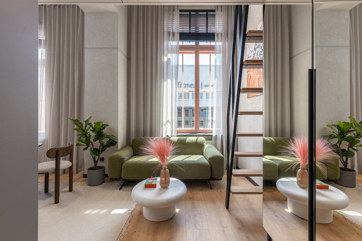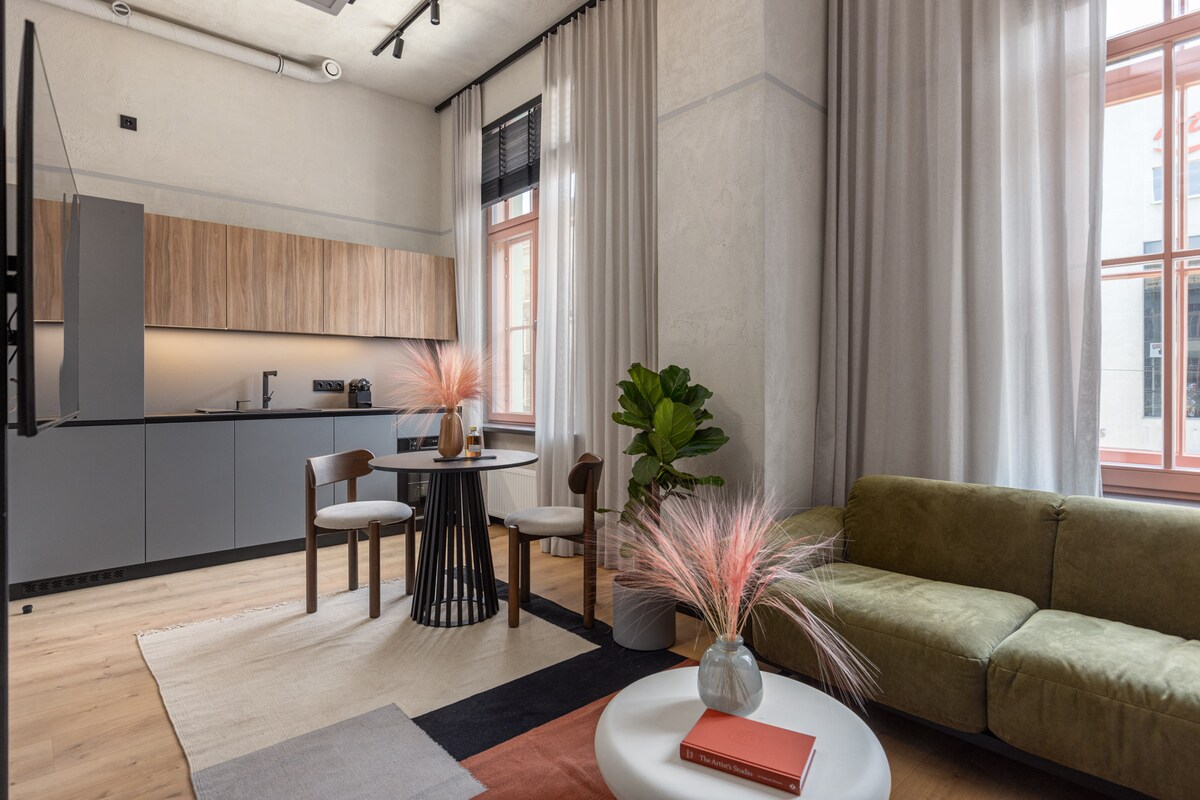 Welcome to Hallo Loft! Discover our sophisticated and cute studio apartment with an amazing loft sleeping area in the heart of Riga. Featuring a sleek design with modern furnishings and stylish accents, this space includes a fully equipped kitchen, a modern bathroom, and a comfortable living area with views of a quiet courtyard. Located in the vibrant city center, you’ll be just steps away from cafes, restaurants, shops, and gyms. Experience modern comfort and convenience at Hallo Loft!