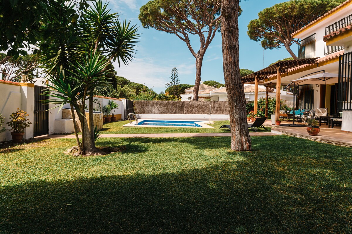 COMPLETELY RENOVATED HOUSE in 2022. Independent villa, with private pool, 10 minutes walk from the beach, situated within the private borough of Roche, Cádiz. The house has 4 bedrooms, 2 bathrooms, kitchen and living room, as well as a 600 m2 garden. It fits for 9 people in 3 double beds and 3 single beds. Kitchen gear, bedding, towels and garden furniture are available. Ramp access for people with reduced mobility.