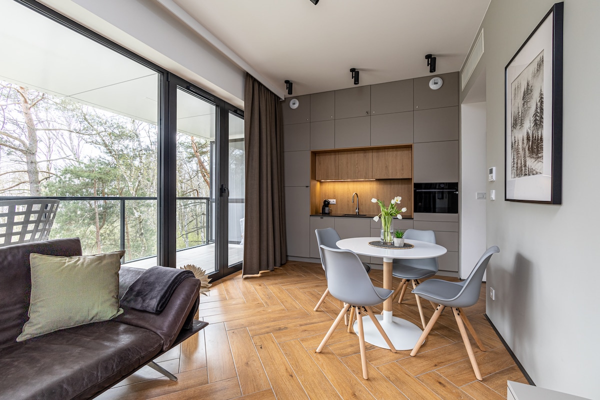 I-Baltic Atelier yindlu yamaplanga yanamhlanje enomoya opholileyo enokuhlala abantu abayi-2 ukuya kwabayi-6 ngaselwandle eGrzybów kufuphi neKołobrzeg Iindwendwe zethu zilinde: - Igumbi lokuhlala elinomatshini okhupha umoya obandayo okanye oshushu elinesofa, indawo yokutyela, iTV, iWiFi yasimahla, - ikhitshi elincinci elinehob ye-induction, umatshini wokuhlamba izitya, ifriji nezixhobo, umatshini wokwenza ikofu weekhapsuli - iibhedi ezitofotofo ezinomatrasi nezinto zebhedi zasehotele - igumbi lokuhlambela neshawa eneshawa yamanzi amakhulu - iveranda nefenitshala yeveranda -BBQ - indawo yokupaka yasimahla - I-sauna yangaphandle (kufuneka ubhatale imali eyongezelelekileyo)