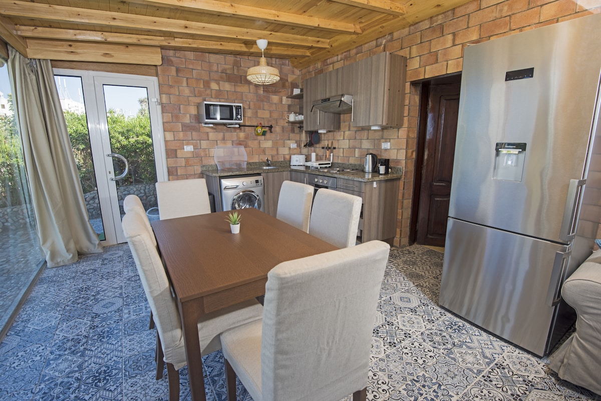 Ikwindlela engundoqo yonxweme lolwandle lwaseHurghada (i-Old Sheraton road) kumbindi wesixeko kufutshane nayo yonke into kwaye ubomi bukwiiyure eziyi-24. Indlu yeholide eyakhiwe ngamaplanga ekuthiwa yi-Luxury igumbi lokulala elikwigumbi lokuhlambela elihle kunye nendawo yokwamkela iindwendwe ekwindawo entle yolwandle kwaye inekhitshi elivulekileyo elinento yonke, itafile yokutyela kunye nendawo yokuhlala. Indawo yokungena yabucala esuka kweyona ndlela iphambili kunye nendlu yeholide eyakhiwe ngamaplanga iqhotyoshelwe kwigadi encinci enefenitshala yangaphandle ukuze wonwabele izinto eziluhlaza nolwandle. Ifenitshala kunye nokufikelela kutsha ngokupheleleyo kwi-IKEA