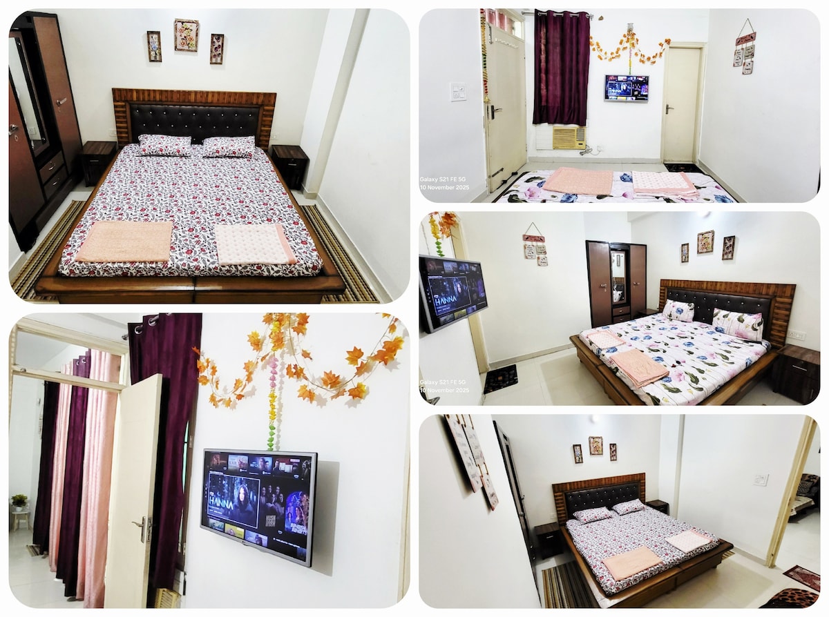 Le flethi okanye indlu ekwicomplex evulekileyo ilandela imigaqo yokuhombisa encinci. Inekhitshi elincinci, amagumbi okuhlambela amabini, ibhedi enkulu, Ibhedi enkulu eyiWall Bed, iTV eneNetflix, iHotstar, iPrimeVideo, iJioCinema neWiFi yasimahla, le ndawo ikwazi ukwamkela intsapho yabantu abane. Nceda UQAPHELE: Le yiflethi evulekileyo, ibe akukho magumbi okulala abucala, iflethi ikumgangatho wesibini, ngoko kuza kufuneka unyuke izitepsi ezimbini. Akuvumelekanga IIPATI 🙏🏽 ibe akuvumelekanga UKUTSHAYA 🚭