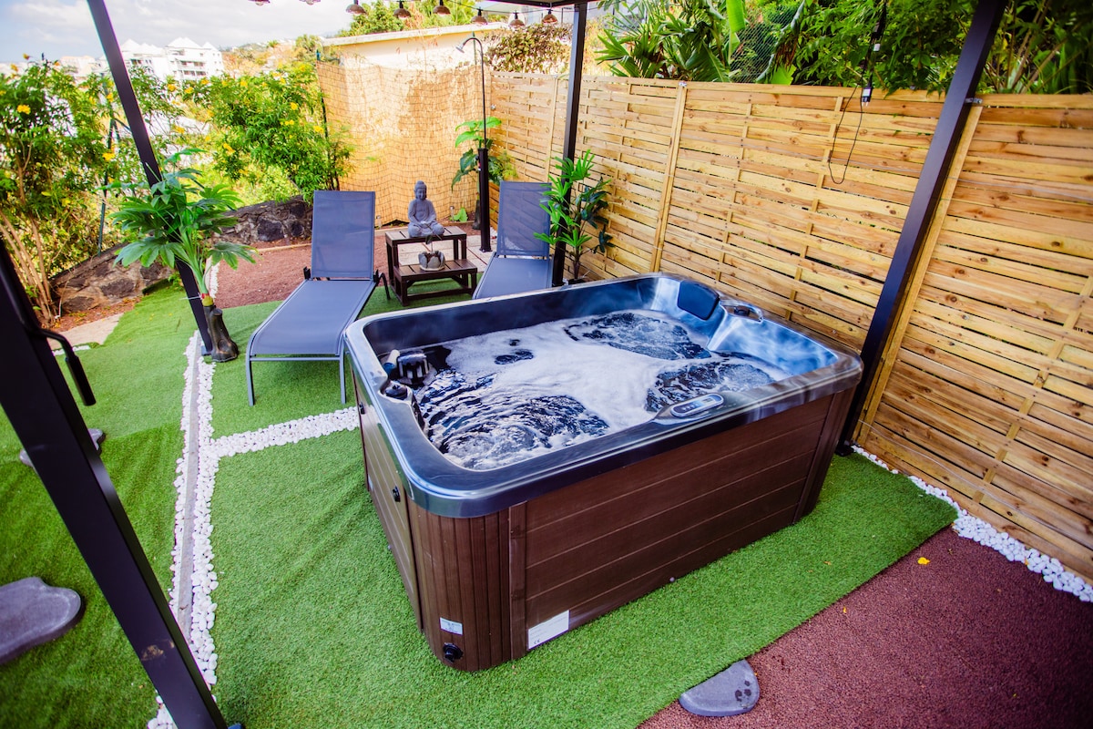 Le ndawo yokuhlala ipholileyo, enezinto ezipheleleyo yenza intsapho ihlale kamnandi okanye abantu abayi-4. Kwinqanaba legadi, nangaphandle kwayo nayiphi na i-vis-à-vis, ungonwabela i-jacuzzi kunye ne-terrace enkulu eyi-35m2 kunye ne-Saint Denis entle. Uza kukwazi nokungena kwipuli yethu yokuqubha (engafudunyezwanga), amaxesha ekugqitywe ngawo xa ufika. Ifumaneka kakuhle eColline des Camélias, uza kufutshane neevenkile zasekuhlaleni, imizuzu eyi-10 ukusuka kumbindi wesixeko, kunye neekhilomitha eziyi-10 ukusuka kwisikhululo seenqwelo-moya.