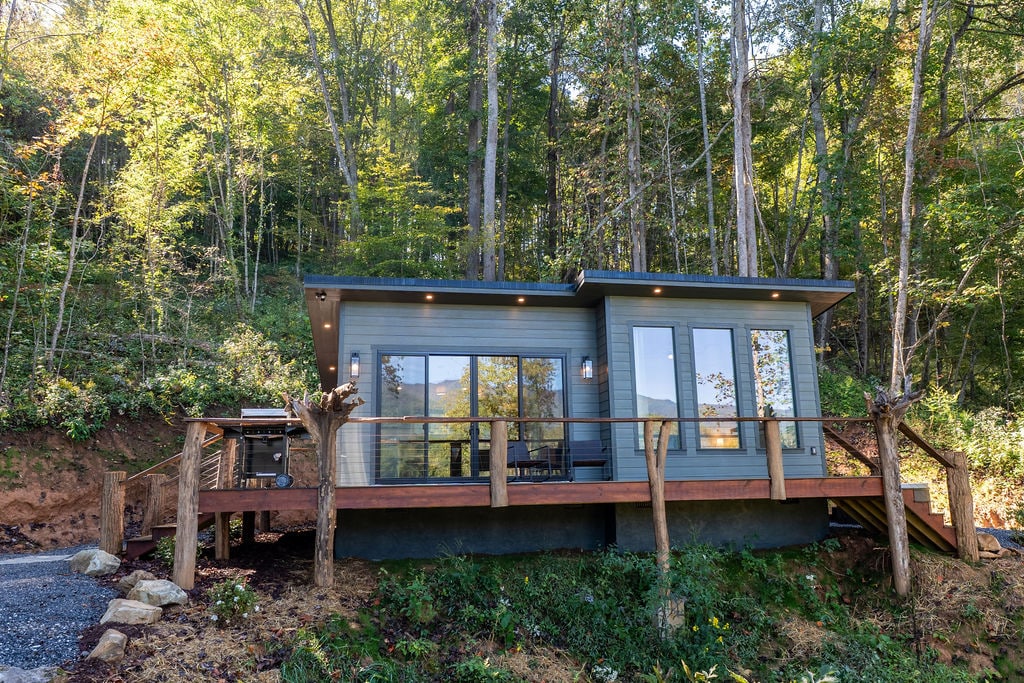 Indlu yamaplanga yeglasi yale mihla kufuphi neendlela, iwayini, kunye neDahlonega