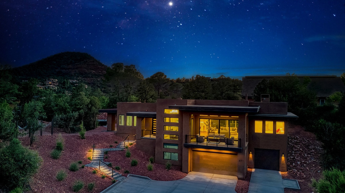 Spacious Uptown Custom home, (2) Master Suites! Red Rock views from every room! Hot tub, Steam room, Tesla charging. Fast WIFI. (2) Dining rooms, LR w/Stone-Gas Fireplace, FR w/85" Smart TV, (2) Covered Patios to enjoy the views and stargazing. Gas BBQ, Al Fresco dining up to 8. Quiet setting, nestled in Sedona's natural beauty with short walk <1 mi to Cafes, Restaurants, Jeep Tours & Shops in Uptown. 1mi to Tlaquepaque Arts Village, over 200+marvelous hiking trails, 2hrs to Grand Canyon.