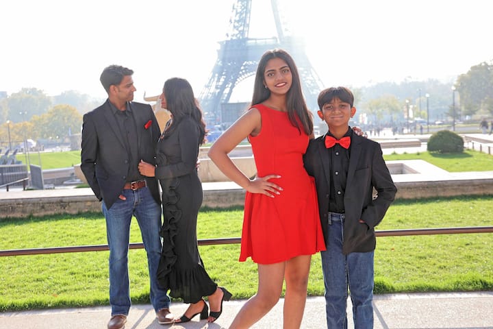 Ukufotwa kwentsapho kwi-Eiffel Tower edumileyo nomlambo iSeine.