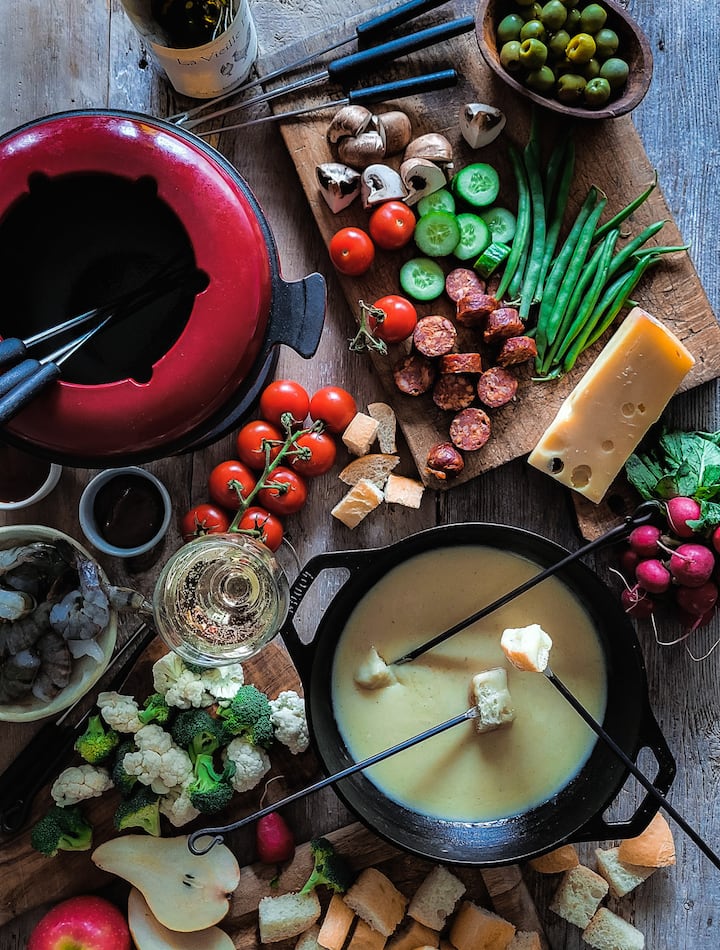 Uza kufumana i-cheese fondue kunye nokusasazeka okukhulu kwenyama, isonka nemifuno yasekuhlaleni. Kwizimuncumuncu uza kuba nefondue yetshokolethi eneziqhamo namaqebengwana.