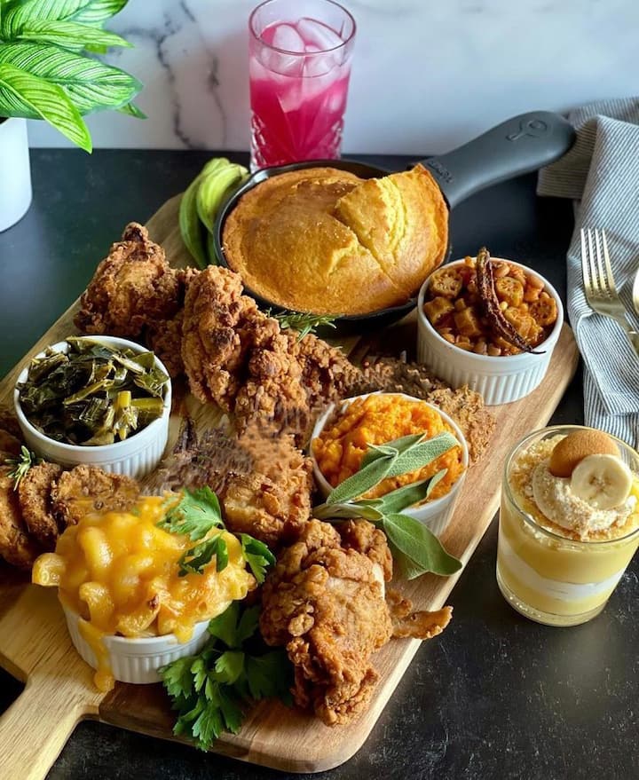 Inkukhu eyosiweyo, i-Catfish, i-gumbo, i-pork chops, i-mac netshizi, i-jambalaya, i-collard greens, i-cornbread, i-peas enamehlo amnyama, i-Sweet Potato Pie, i-Blackberry Cobbler, i-Peach Cobbler, i-Red Velvet Cake, i-Southern Sweet Tea, i-Cranberry Spritz, i-Mojito.