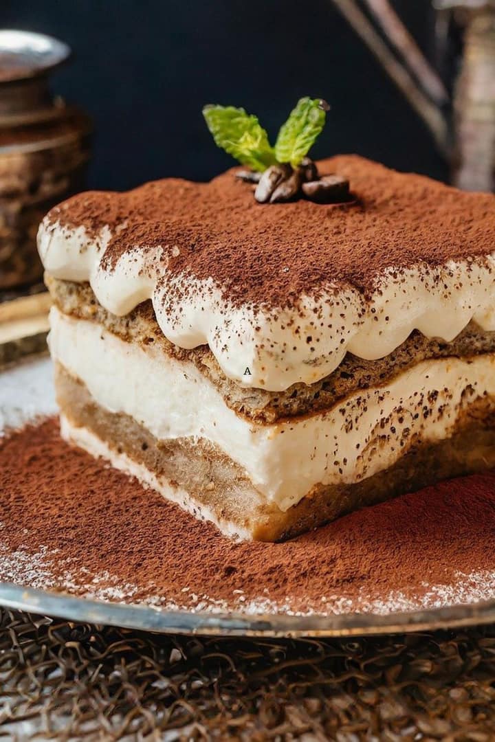 I-Tiramisù yi-dessert yase-Italy yekofu- kunye ne-liqueur-soaked ladyfinger enekhilimu ye-mascarpone enomoya kwaye igqitywe ngothuli lwe-cocoa ekrakra.