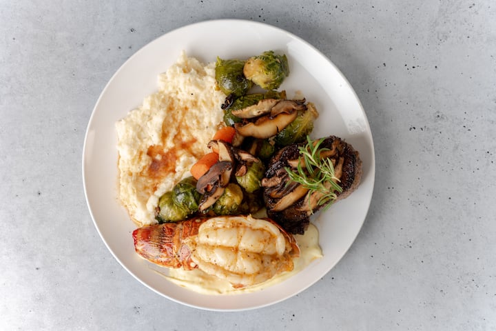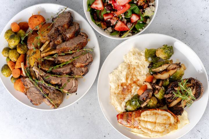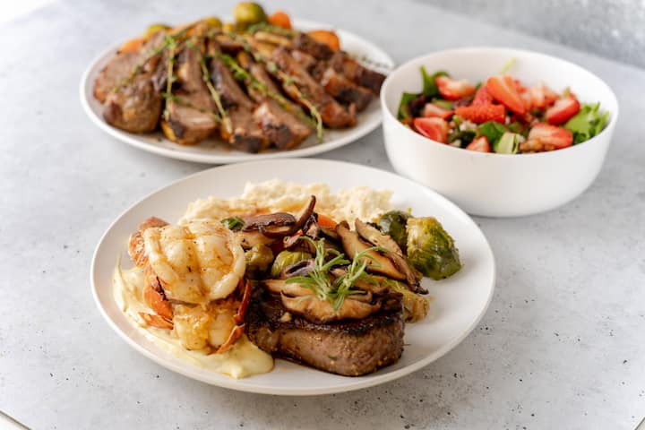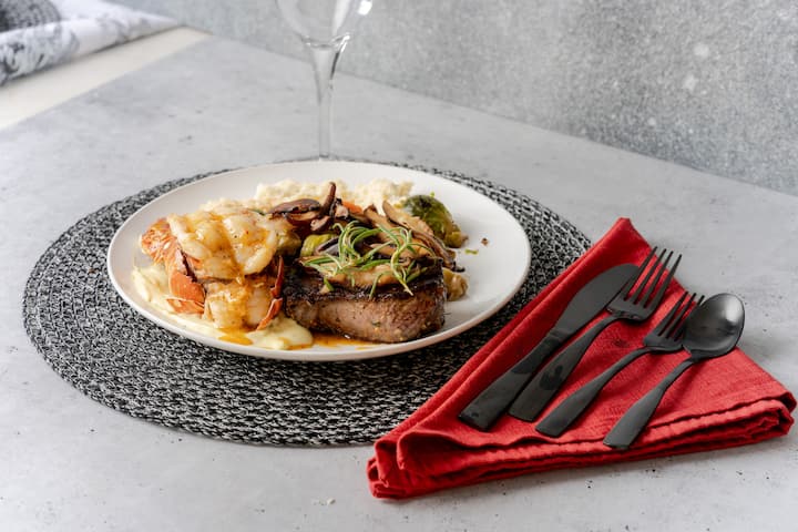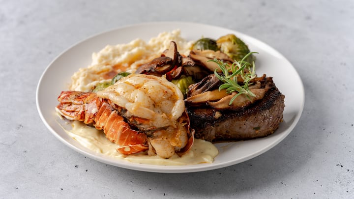 Eli theko libonisa inyama ebolileyo kunye nokutya kwaselwandle, kunye nezinto onokukhetha kuzo ezifana ne-ribeye, i-filet mignon, i-scallops yaselwandle, kunye ne-salmon emnyama.