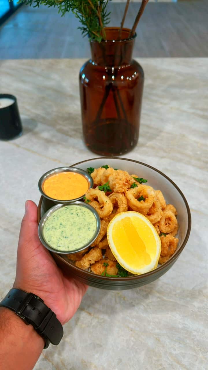 Isidlo sokuqala: I-calamari eyomeleleyo, i-calabrian chili mayo kunye ne-basil/dill remoulade