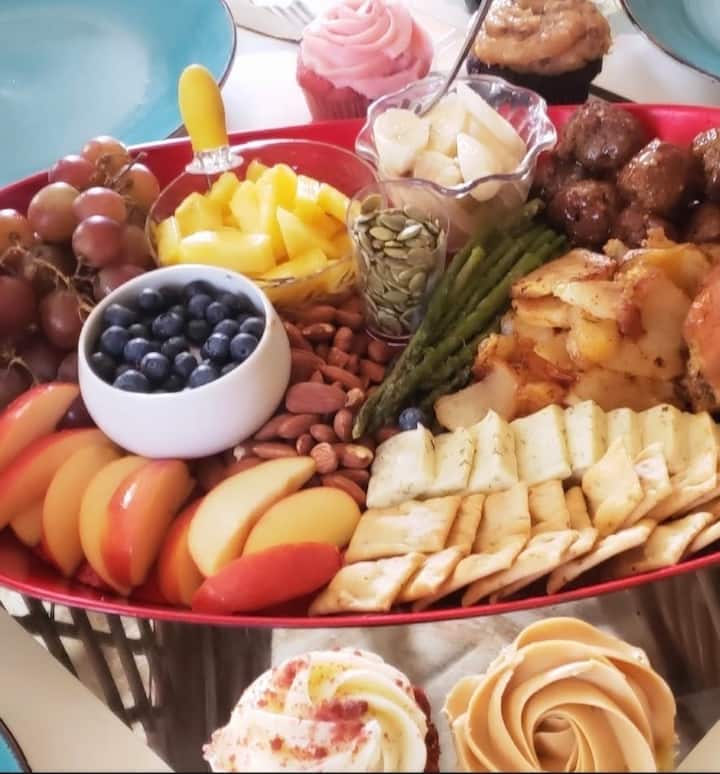 Iibhodi zeCharcuterie; I-European & Mediterranean Kunye nePepper Hummus; I-Medley yeSeadonal Fruit & Caramel, I-Yogurt Dips; I-Menagerie yemifuno kunye ne-Sweet Baldamic Ranch