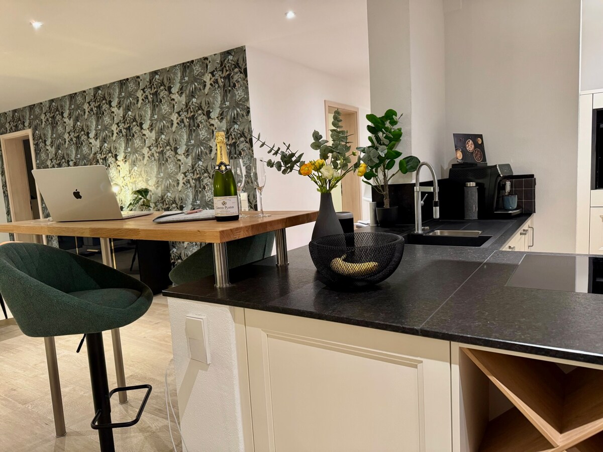 Unsere nagelneue, moderne Boho-Ferienwohnung verbindet höchsten Komfort mit natürlichem Flair: warme Farben, Gräser und Holzelemente sorgen für Wohlfühlatmosphäre. Zwei Terrassen, zwei Bäder und Platz für bis zu 8 Erwachsene. Top-Lage: Bäckerei und Pizzeria nur 20 m, Bushaltestelle 30 m, Stadtteich 60 m, Spielplatz 40 m, Fußballplatz 150 m. Ausreichend Parkplätze in der Umgebung. Eigener Eingang!
