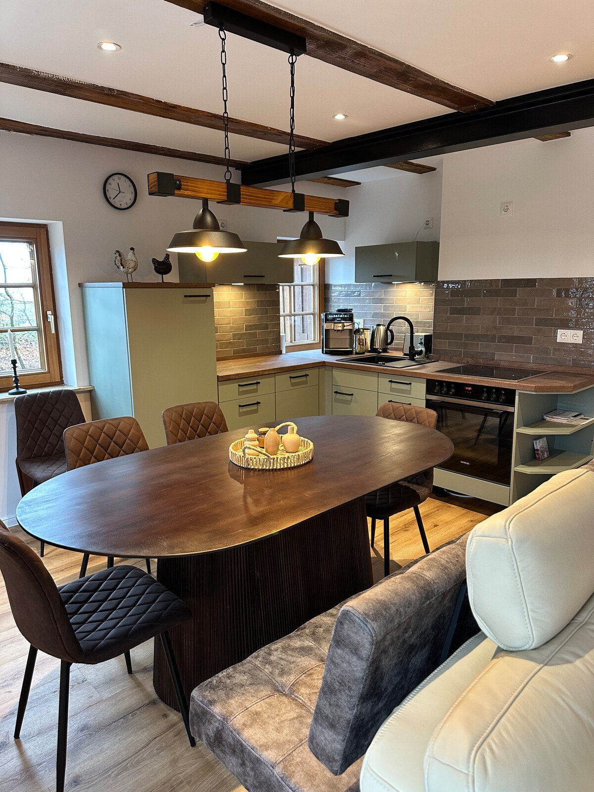 Le flethi ikumgangatho wokuqala wendlu endala esefama Isitudiyo esimalunga ne-37sqm sinekhitshi, indawo yokutyela, kunye nendawo yokuhlala neyokulala Igumbi lokulala elahlukileyo linebhedi ekwayisofa (140 x 200cm), kunye nebhedi enye Igumbi lokuhlambela elineshawara nendlu yangasese Igumbi lokugcina i-Smart TV kunye ne-Netflix kunye nebha yesandi Ukubona iindawo ezingaqhelekanga emaphandleni Ifenitshala yasegadini, indawo yokoja yamalahle ioyile yokupheka, izixhobo zokupheka kwiziqholo Ilinen yebhedi neetawuli Uyilo lwangaphakathi: raumvertraut.de, iifoto: sirkojunge.de