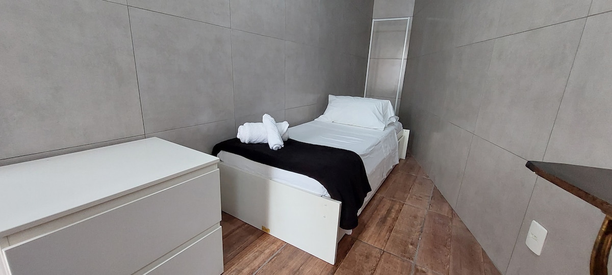 Mini casa completa para uma pessoa. Não permitimos visitas. Não aceitamos reserva feita para outra pessoa e/ou revezamento. Cama baú solteiro c/ colchão de mola e 2 travesseiros. Tv smart 24 pol Wi-fi 500 mg Ventilador de teto Geladeira, fogão, microondas e demais eletrodomésticos Cafeteira básica Utensílios de cozinha Roupas de cama e banho Chuveiro eletrônico Lavanderia e área de lazer compartilhadas Ambiente familiar e tranquilo Não temos estacionamento Atenção às demais informações