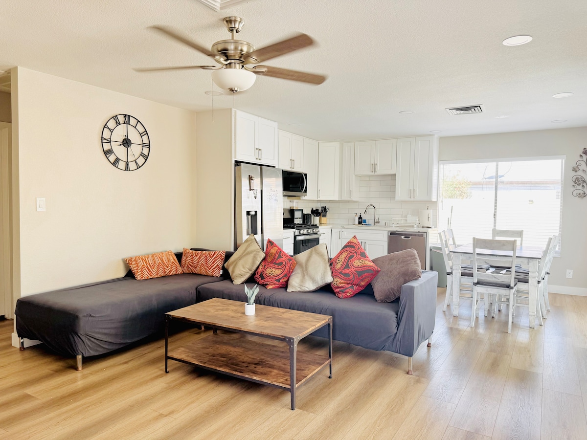 Relax with the whole family at this peaceful place to stay. Renovation was finished in 2023 with new appliances. There are 3 bedrooms in the house--1 King and 2 queens. Backyard is fully accessible with a patio. We provide Hulu, Disney+, Peacock and Paramount on our TVs. To the Strip: 20 Minutes drive To Red Rock Canyon: 15 minutes drive To the airport: 20 minutes drive No garage access. Driveway fits 2 vehicles. Free street parking included.