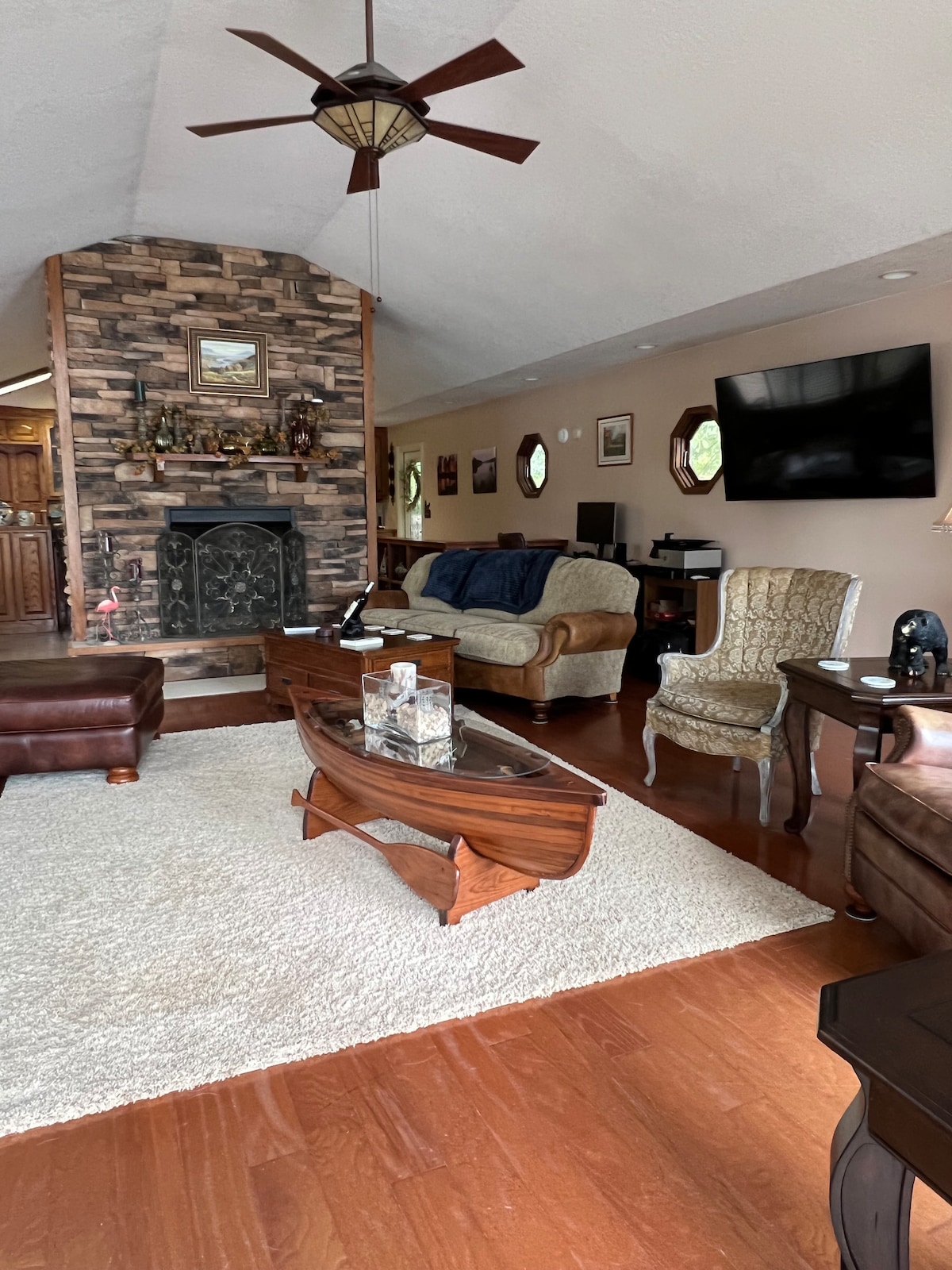 Ukuhlala ixesha elide kwamkelekile! Idokhi yabucala, indawo yokutyela enkulu, umgangatho omkhulu, ihlolwe kakuhle kwiveranda, i-wifi, i-DVD kunye ne-VCR. i-gas grill, umngxuma womlilo, umatshini wokuhlamba/ wokomisa impahla, i-50" Roku tv, isitovu, ifriji, kunye nembiza yekofu. Le ndlu ihleli kancinci xa isuka emanzini , kodwa ukuhamba ngeenyawo ikumgangatho ophezulu ibe kulula. Idokisi labucala.