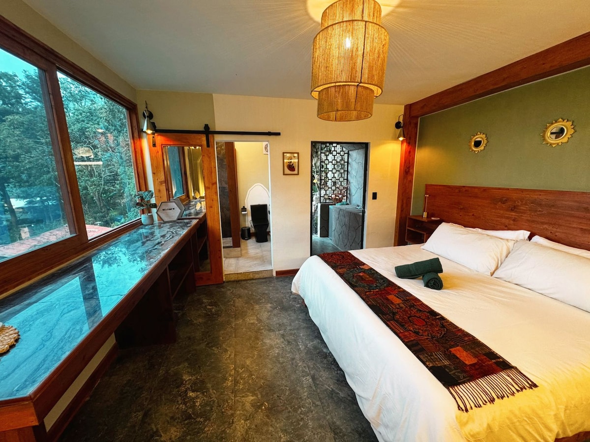 Enjoy a cozy, family-friendly room at our boutique hotel on Lake Atitlán. The space includes a Queen bed and a double bed, with a newly renovated private bathroom just steps away. A large window brings in natural light and beautiful lake and garden views. Guests have access to a private pool, sauna, jacuzzi, outdoor kitchen, and dock. Start each morning with a stroll through the gardens or a complimentary locally sourced breakfast.