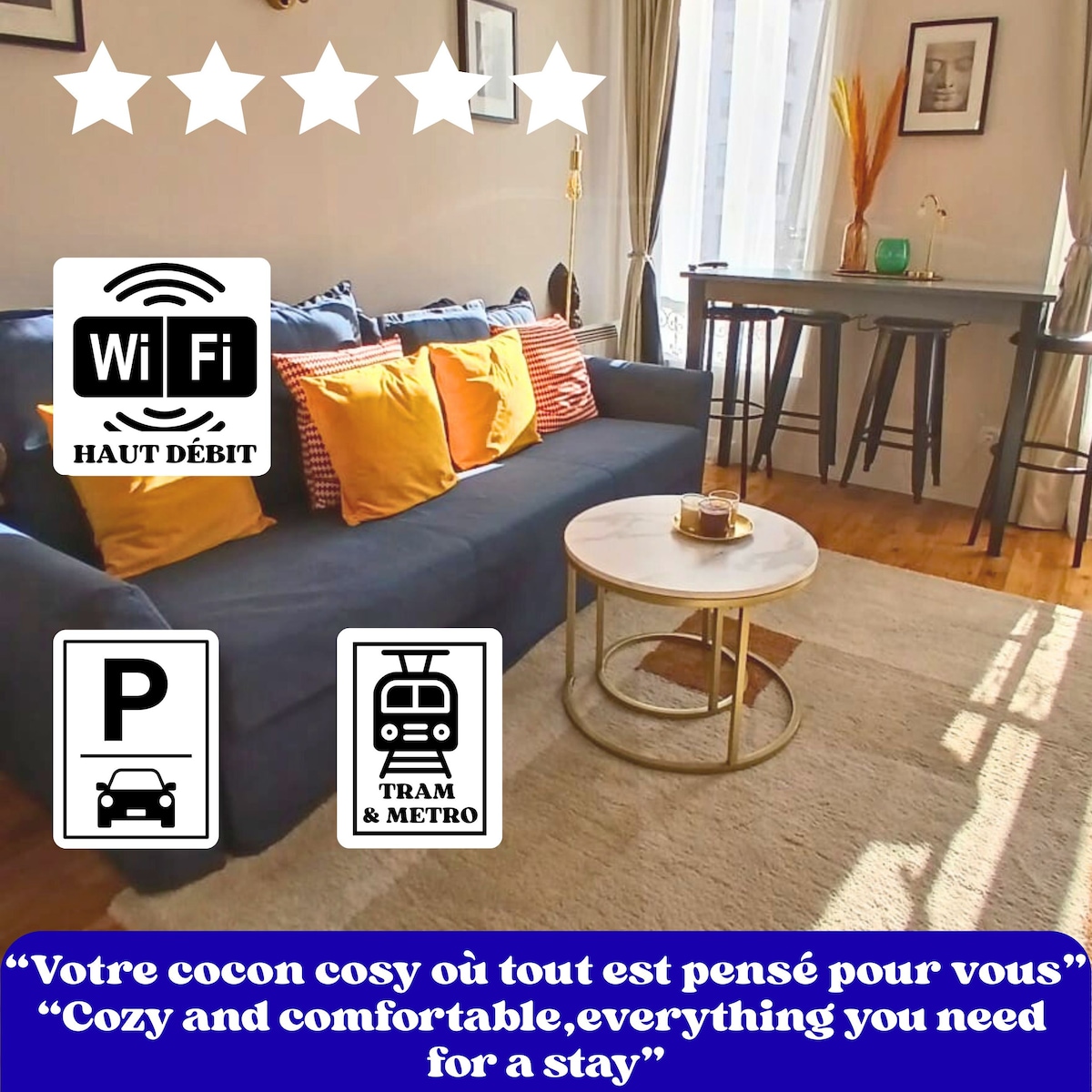 Indlu esemaphandleni ethe cwaka enegadi Igumbi lokulala, ikhitshi, indawo yokuphumla egadini ebiyelweyo ezimeleyo Ifakwe yonke into enomatshini wokomisa impahla, i-wifi yefayibha, iNetflix equkiweyo simahla nekhitshi elilungele ukusetyenziswa Ibhedi elala abantu ababini etofotofo kwigumbi lokulala nakwisofa kwigumbi lokuhlala. Amashiti anikezelweyo, njengasehotele Emazantsi edolophu yimizuzu eyi-10 xa uhamba ngeenyawo Ziikhilomitha eziyi-8 kuphela ukusuka eParis Iziko laseParis kwimizuzu eyi-30 ngezothutho (Ibhasi + metro) Indawo yokupaka esesitratweni yasimahla nekhuselekileyo Wamkelekile ekhaya