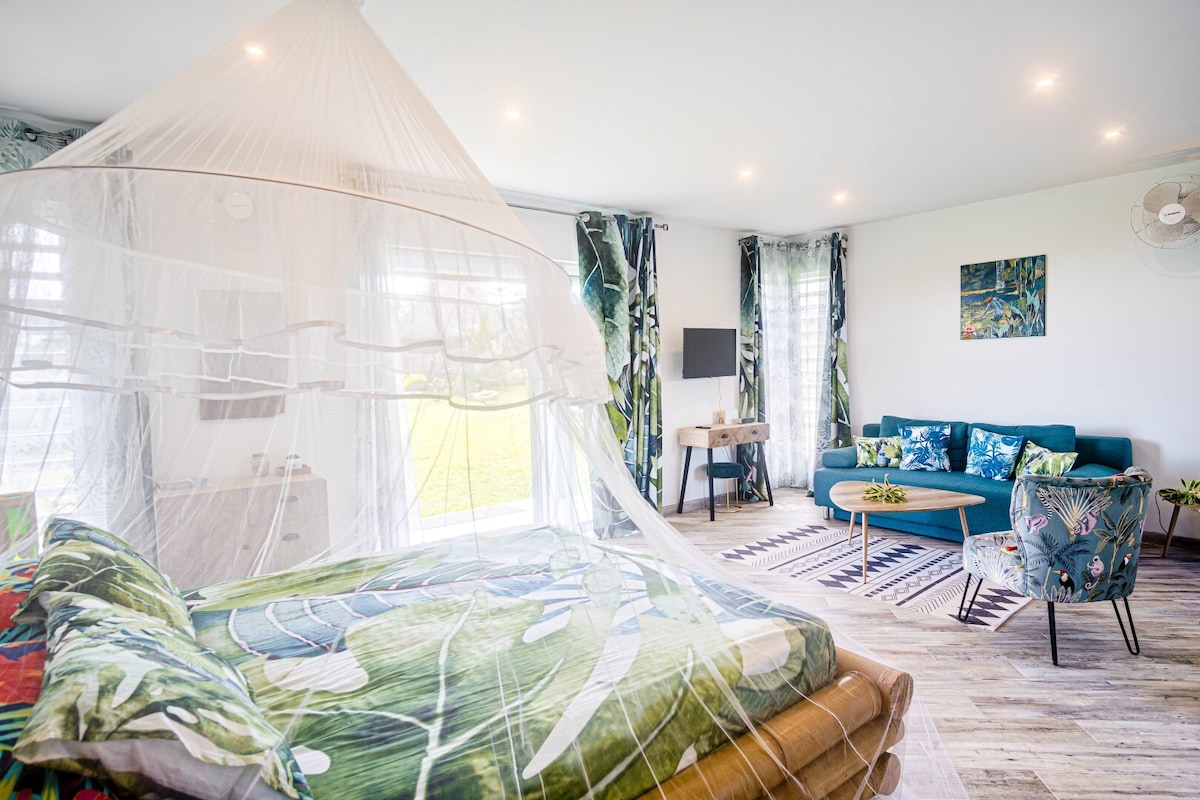 Transport gratuit entre l'aéroport et la villa Très belle chambre luxueuse -appartement hôtel avec dressing, wifi, climatisation et brasseur d'air salle de bain, cuisine équipée avec lave vaisselles, très grande terrasse privée offrant une vue unique et incroyable sur l'océan et la nature et une vallée dans laquelle vous aurez parfois la chance d'admirer une cascade . Entrée privée. Confort total, lit king size.