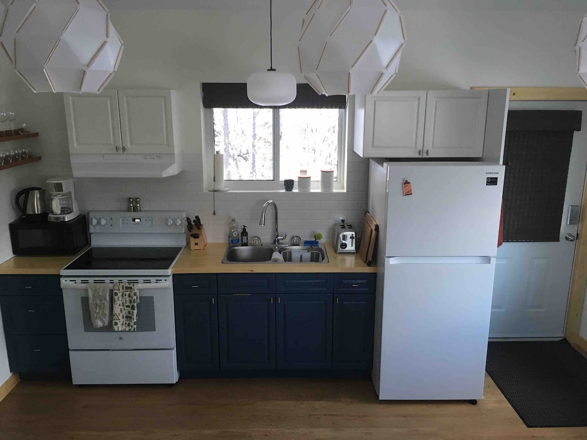 Phumla uze uphole kule ndawo ihonjiswe kakuhle nethuleyo. Ikwindawo ekumgama wemizuzu eyi-15 ukusuka edolophini xa uhamba ngemoto, le suite inegumbi lokulala eliyi-1, igumbi lokuhlambela eliyi-1 elakhiwa ngo-2023. Igumbi lokulala linebhedi engaphezulu kwebhedi enkulu. Le ndawo eyi-3.7 eyi-acre inendawo eluhlaza engapheliyo kunye neendlela zokuhamba. Le suite inendawo ephezulu eyi-400 sqft enezinto ezintle ezibonakalayo zentaba kwaye inokuba yinto entle yokubona izibane zasemantla. Idekhi inefenitshala yeveranda nendawo yokubasa umlilo. Ecaleni kwegumbi eliqeshisayo kukho ikhaya elihlala abanikazi bezindlu.