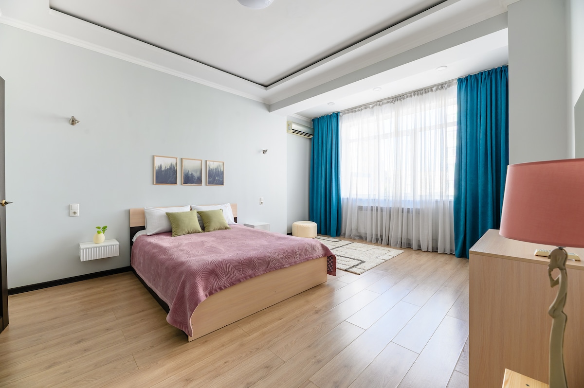 Siyintsapho yasekuhlaleni enikezela ngeflethi yethu evulekileyo eyi-220 sq.m kufutshane neCentral Stadium, elungele iintsapho okanye amaqela. Inamagumbi okulala ayi-3, igumbi lokuhlala, ikhitshi, indawo yokutyela, amagumbi okuhlambela ayi-3, iibhalkhoni eziyi-3, iikhabhathi eziyi-2 neebhedi eziyi-7 - kwindawo ekhuselekileyo esembindini wesixeko. Kuthi, awuzukuqeshisa nje ngeflethi, kodwa uza kuba nezona nkumbulo zintle zikaAlmaty: umama angakubulisa ngokutya okwenziwe ekhaya, kwaye utata angakuthatha kwisikhululo seenqwelo-moya. Ndithumelele umyalezo apha ukuba unemibuzo, kwaye wamkelekile!