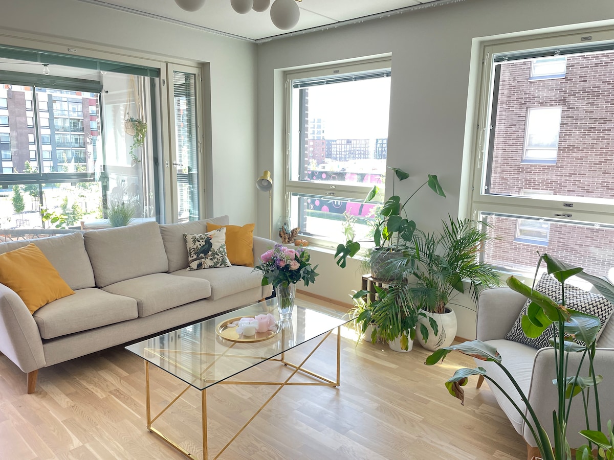 I-air conditioned yanamhlanje iflethi eyi-43,5 sqm kwisakhiwo esitsha senqaba ecaleni kwesikhululo sesitimela saseMatinkylä kunye ne-Iso Omena shopping mall (i--2018 shopping mall yonyaka we-NCSC). Ukubuka umgangatho we-16 emangalisayo (umgangatho we-14 wokuhlala) ukusuka kwibhalkhoni enkulu egqamileyo enendawo yokuhlala. Iziko lesixeko saseHelsinki likude kangangemizuzu eyi-20. Igumbi lokulala elinye elinebhedi enkulu kwilizwekazi (ububanzi obuyi-180 cm) kunye nesofa yegumbi lokuhlala ineebhedi eziyi-3 eziyi-80x200 cm ezilula.