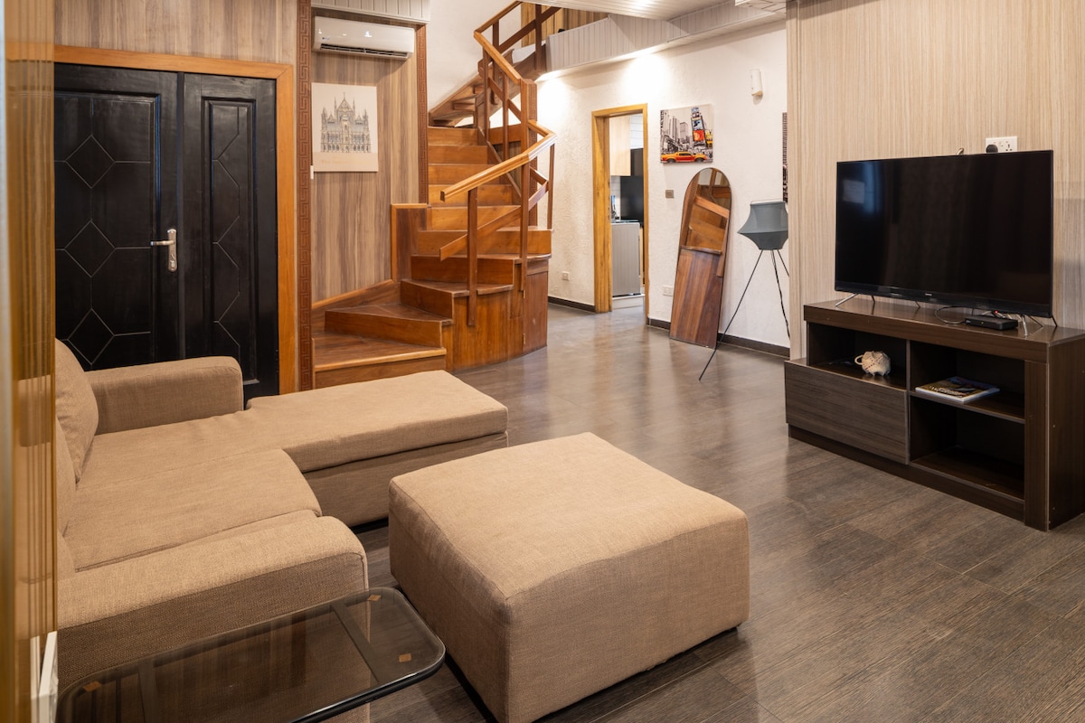 Yonwabela ubuhle bale ndawo ihonjiswe kakuhle. Imizuzu eyi-5 xa uhamba usuka kwisikhululo seenqwelo-moya nemizuzu eyi-3 xa uhamba usuka eAccra Mall. Indawo yokuqala esentliziyweni ye-Accra - Fibre Wifi - Business Ultra DStv - Isidlo sakusasa esizeni - I-Smart TV+ Apple Airplay - Imidlalo yebhodi - Iincwadi - Ijimu -Ukhuseleko lwe-24/7 kunye nedesika yokwamkela - Ipuli yokuqubha - I-generator Iyafumaneka - Iitanki zamanzi - Indawo enoxolo - Indawo yokupaka - Inkonzo yokucoca - Inkonzo yokuhlamba iimpahla - Ilungele ukuhlala ixesha elide
