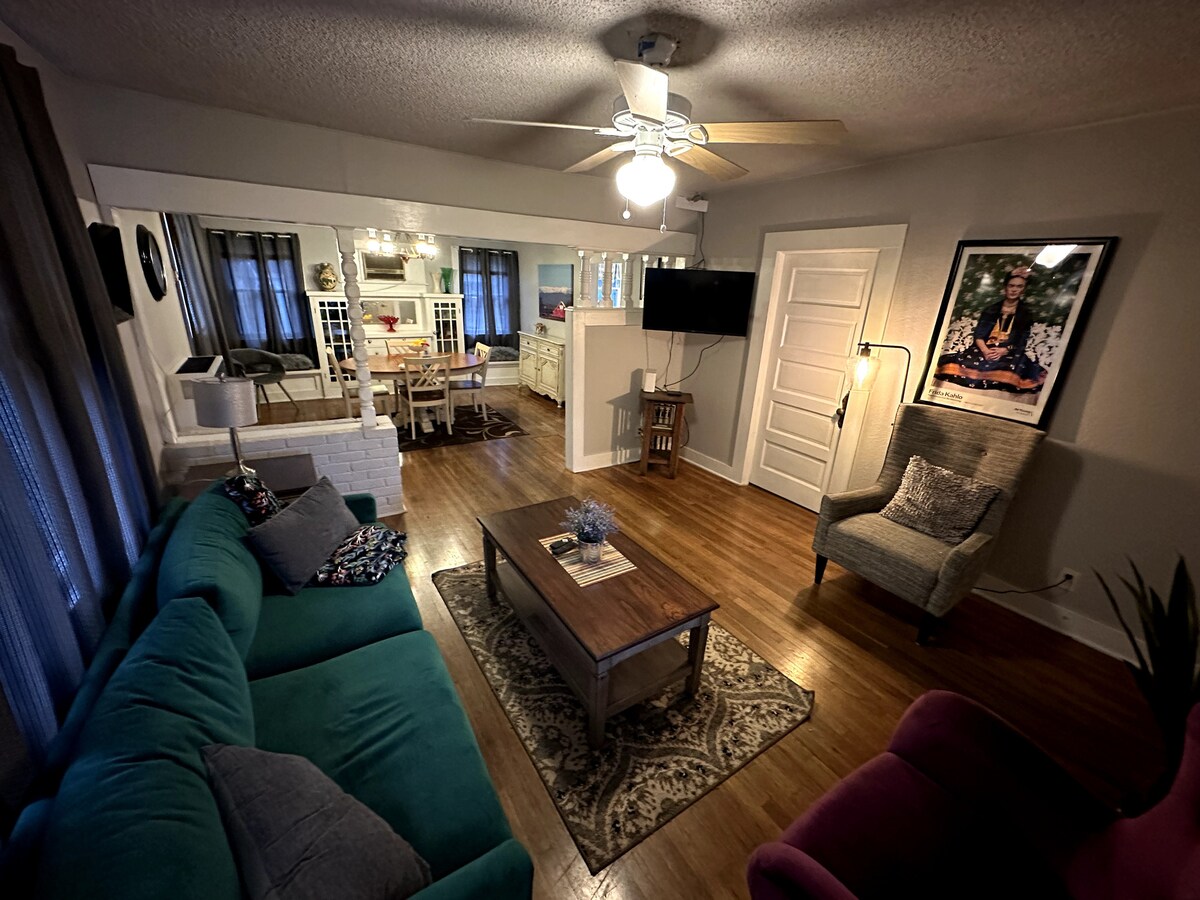 Welcome to your luxury retreat in Downtown Modesto! This fully remodeled 2BR/1.5BA Midcentury Modern home offers: • 1,150 sq ft of stylish double story home with spacious living space with new kitchen and baths • Large yard with paver-lined grass, Edison lights, and fire pit • 65” Smart TV, 1200mbps WiFi, 4K security system, and smart garage • Queen bed with desk, plus two twin beds, all with premium linens • Walking distance to fine dining, nightlife, and attractions