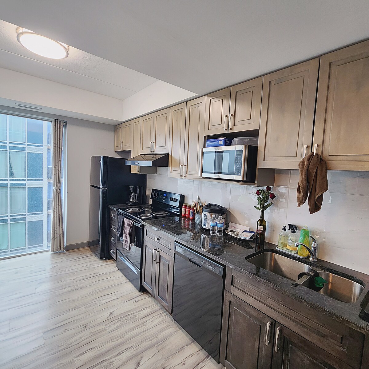 I-suite yekona ye-2BR/2BA entle kakhulu kanye phakathi eKitchener, ngqo phambi kweGoogle Kitchener Downtown. Yonwabela ukubona isixeko, indawo enento yonke enokuhlala iindwendwe eziyi-7 nangaphantsi, nezinto ezinokusetyenziswa ezimangalisayo ezifana nebhafu enamanzi ashushu, indawo yokudlala i-bowling, i-sauna, iveranda eseluphahleni kunye nejimu. Iquka indawo yokupaka yasimahla. Le Airbnb enelayisensi epheleleyo ikunika indawo yokuhlala engenazingxaki kwingingqi enabantu abaninzi onokuhamba kuyo ngeenyawo nenokufikelela lula kwiLRT nakwi-GO Station.