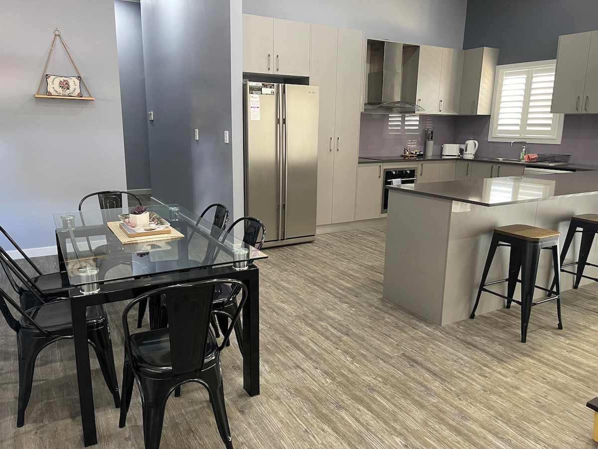 Igumbi lokulala eli-4 Ikhaya kunye ne-Reverse Ducted Air & Spa Ukuhamba kancinci ukuya kwiSitrato esikhulu saseThirlmere kuquka iivenkile neeKhefi. I-400m nje ukuya kwiNSW Rail Transport Museum. Nceda uqaphele ukuba ukubhukishwa kweMyuziyam yoLoliwe kubalulekile Iveranda yangaphandle enenyama eyojiweyo xa uyicela Indawo Yokuhlala Evulekileyo Nekhitshi Elikhulu I-Foxtel kwigumbi lokuhlala eliyintloko kunye negumbi lokulala eliphambili Free Unlimited Wifi Kulala ku-10 Abantu kunye 2 x Queens, 1 x Double, 2 x izangoma kunye 1 x Queen Floor Mattress enokusekwa kwigumbi lokulala 4 kunye 2 izangoma