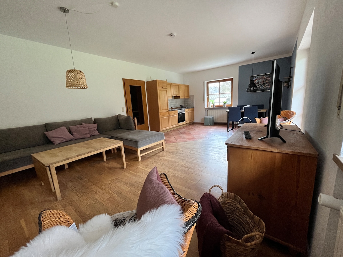 Die Ferienwohnung bietet viel Komfort: Ein großzügiger Wohnraum mit Ledersofa, das sich in ein Doppelbett verwandeln lässt, und ein Esstisch für gemeinsame Mahlzeiten. Die funktionale Küche mit Insel lädt zum Kochen ein. Das Bad mit Waschtrockner, Dusche und Badewanne bietet Entspannung. Das Schlafzimmer ist mit einem Doppelbett ausgestattet. Im Sommer lädt die Terrasse zum Entspannen ein, im Winter sorgt die Fußbodenheizung und der Holzofen für Gemütlichkeit. Holz ist kostenfrei erhältlich.