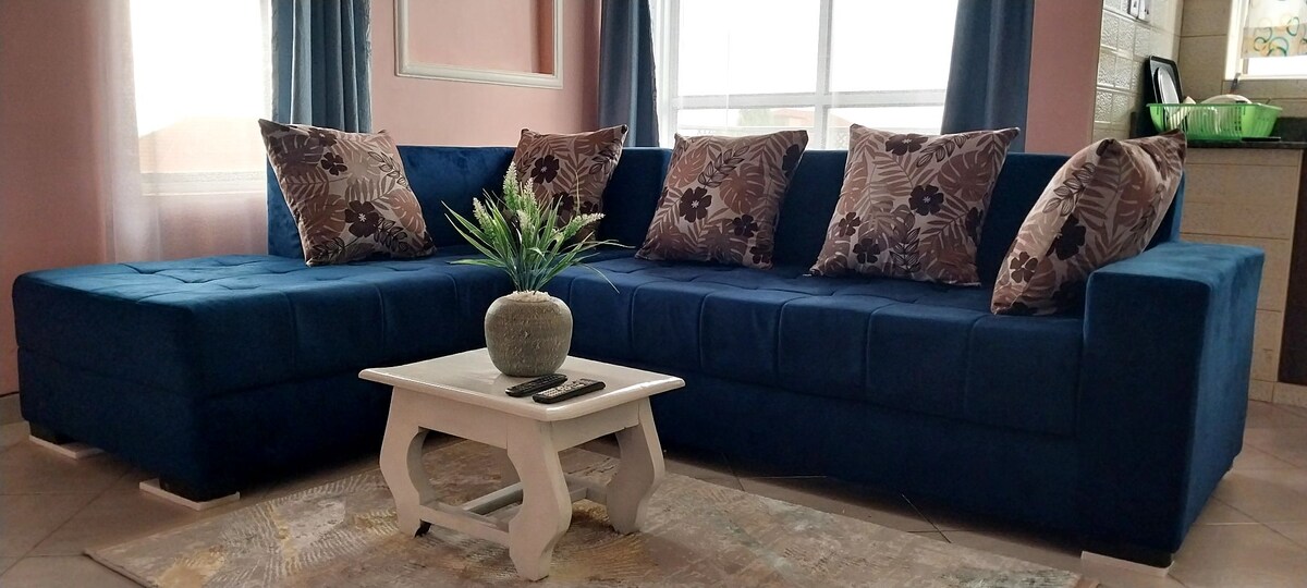 Indawo entle yohambo lwentsapho neqela. Iiflethi okanye izindlu ezikwicomplex ezinamagumbi okulala ayi-3 zinamagumbi okuhlambela avulekileyo ayi-2, iishawa ze-spa, igumbi lokuhlala, iibhalkhoni eziyi-2, ikhitshi elipheleleyo, umatshini wokuhlamba impahla, i-cable tv, i-wifi engenamkhawulo (i-Mtn fibre) nebhari encinci. Izitepsi ezikude neevenkile zokutyela ezahlukahlukeneyo, ipaki yamanzi yabantwana, imizuzu eyi-15 ngemoto ukuya eAcacia mall nakumbindi wesixeko saseKampala. Izinto ezinokusetyenziswa zale mihla nezinto zokuhombisa zale mihla zenza kube mnandi ukuzonwabisa nabani na. Jonga izinto ezifumaneka kwiindawo zokuhlala zaseGabs