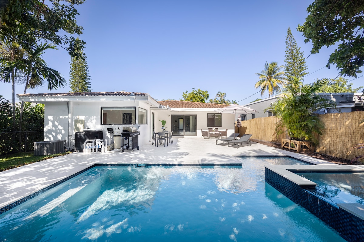 Wamkelekile eBuko House. Indawo entle, evulekileyo, esandul 'ukulungiswa embindini weMiami - yiya naphi na kwimizuzu engaphantsi kweyi-20 uze uhambe ngeenyawo uye kwiibhari nakwiivenkile zokutyela. Ilungele iintsapho okanye amaqela ukuba ziphumule zize zikhululeke, zibe nexesha elimnandi kunye elangeni okanye phantsi kweenkwenkwezi kwipuli entsha entle enespa ejikelezwe zizityalo ezintle zasehlotyeni. Ngaphakathi yindawo entle kakhulu enendawo efanelekileyo yamaqela (indawo enkulu eqhelekileyo, amagumbi okulala abucala, ikhitshi elinezinto ezifunekayo)