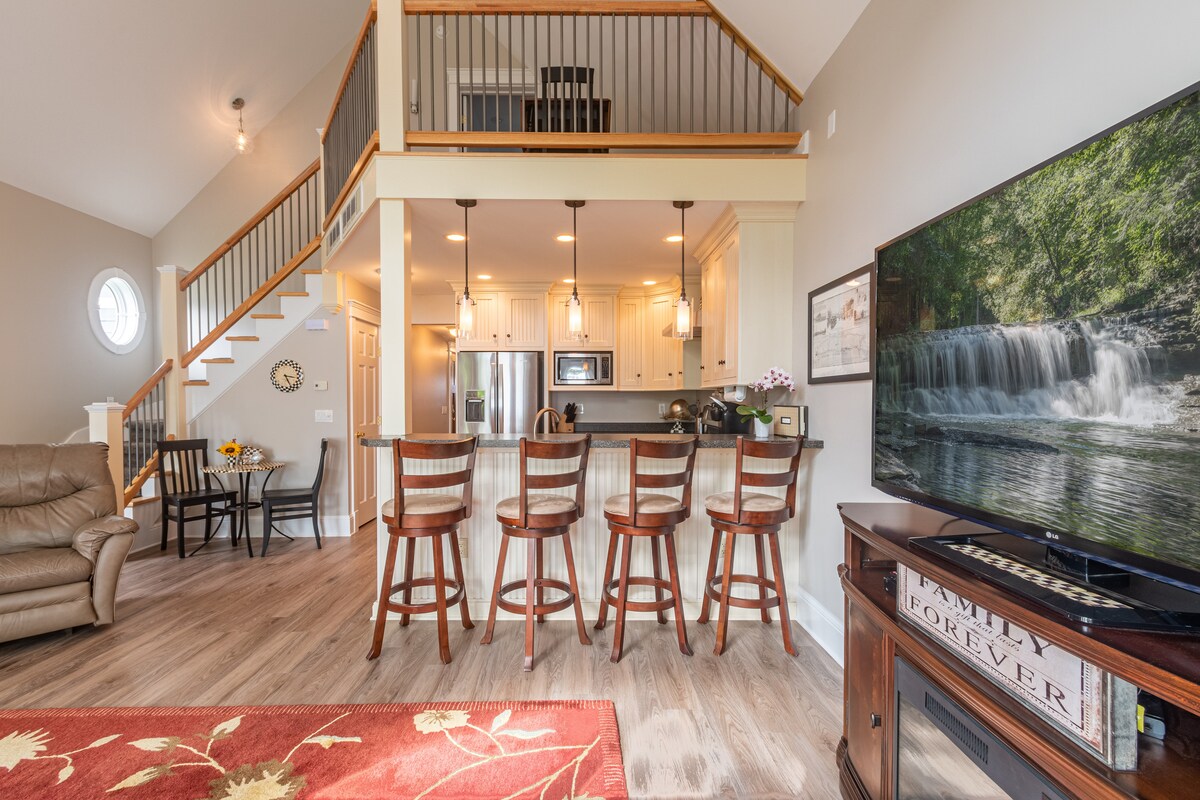 Escape to our cozy 2-bedroom cottage on East Bay minutes from Chimney Bluffs! This retreat sleeps up to 6 guests, featuring two adjustable queen beds and a sofa bed. Enjoy stunning water views, a mounted fireplace, and three Smart TVs for relaxing evenings. The cottage includes a fully equipped kitchen and a large deck with a propane firepit—perfect for cozy nights under the stars. Step out onto the dock for fishing and kayaking, or stay connected at the dedicated work space with fast Wi-Fi.
